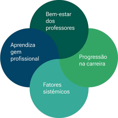Fatores sistémicos:Análise de todos os fatores sistémicos que têm impacto direto e/ou indireto no bem-estar e na carreira dos professores, incluindo currículos, avaliação, políticas, integração de tecnologias, apoio, liderança escolar, relações pais-escola e todos os outros fatores que têm impacto na qualidade da educação.